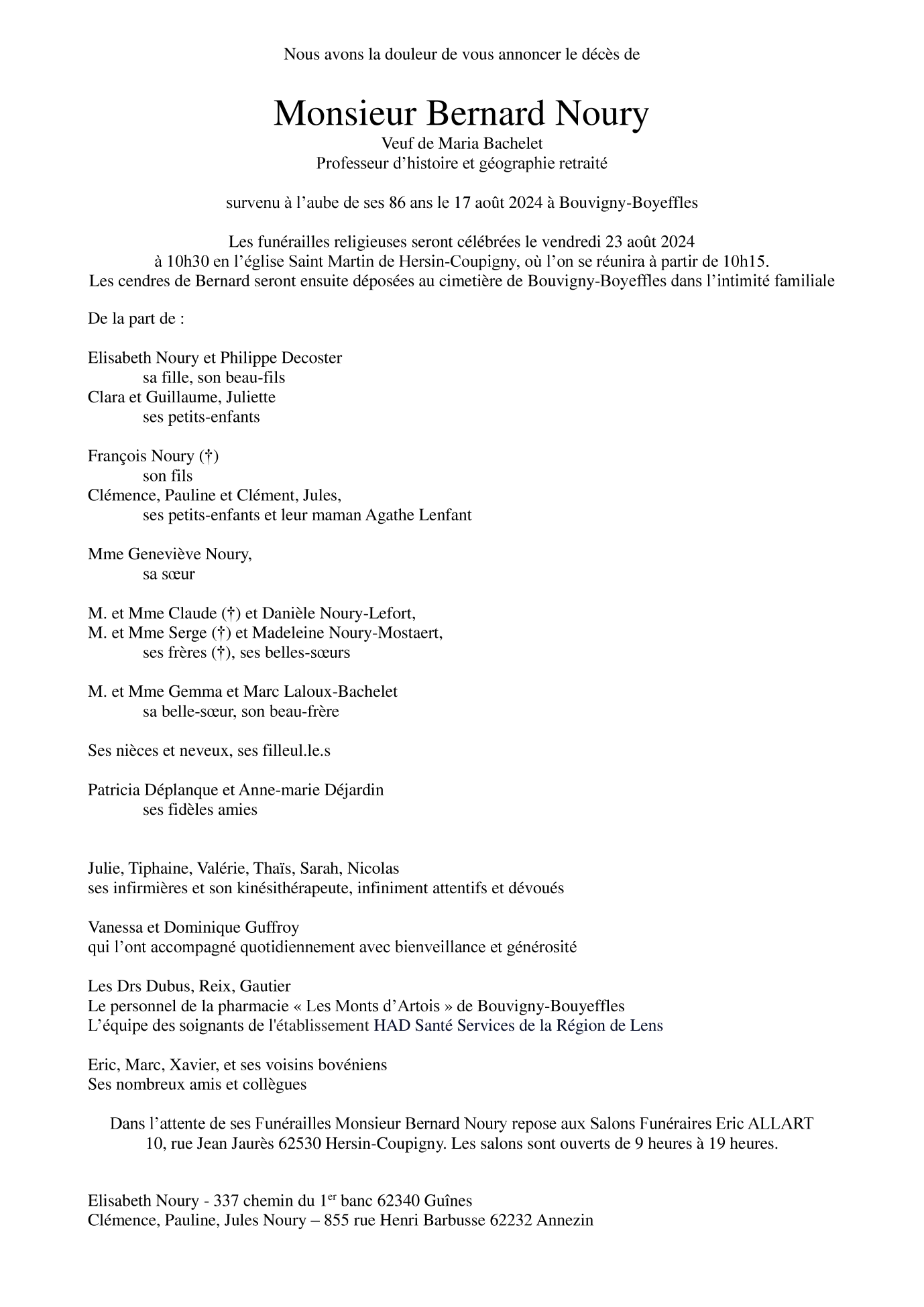 Décédé à Bouvigny-Boyeffles (62172, France) le samedi 17 août 2024 à l'âge de 86 ans
