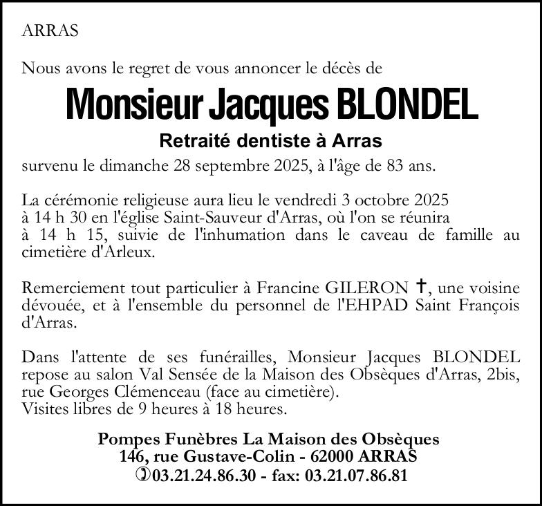 Décédé à Arras (62000, France) le dimanche 28 septembre 2025 à l'âge de 83 ans