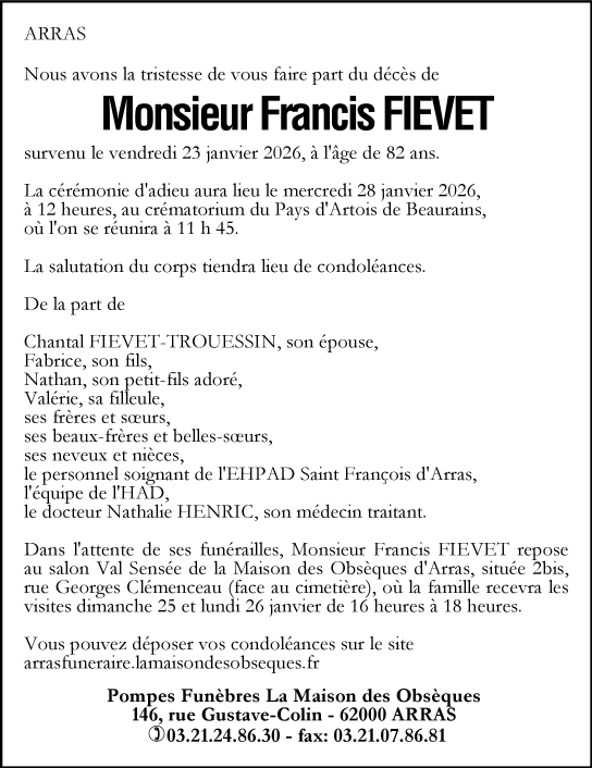 Décédé à Arras (62000, France) le vendredi 23 janvier 2026 à l'âge de 82 ans