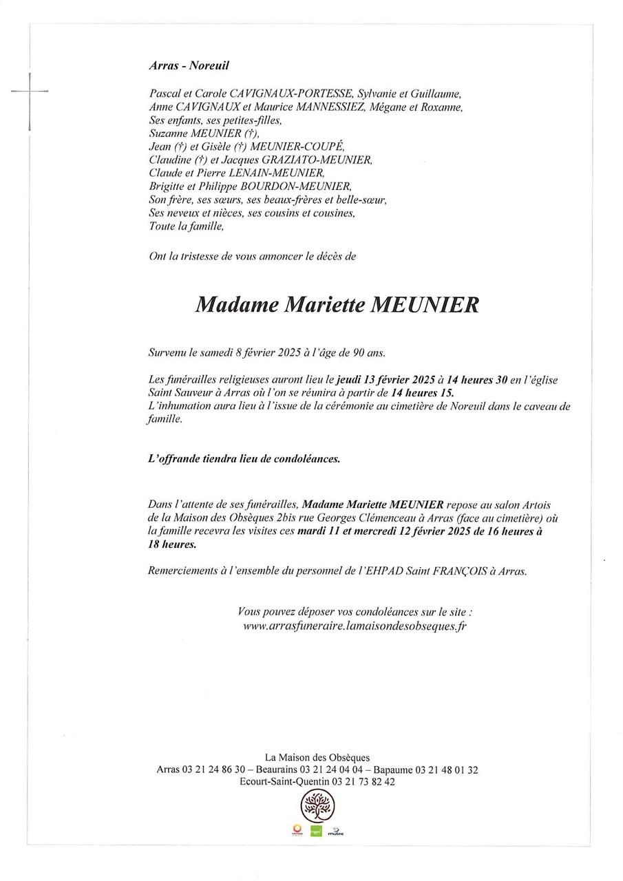 Faire part Madame Mariette MEUNIER 1935 - 2025