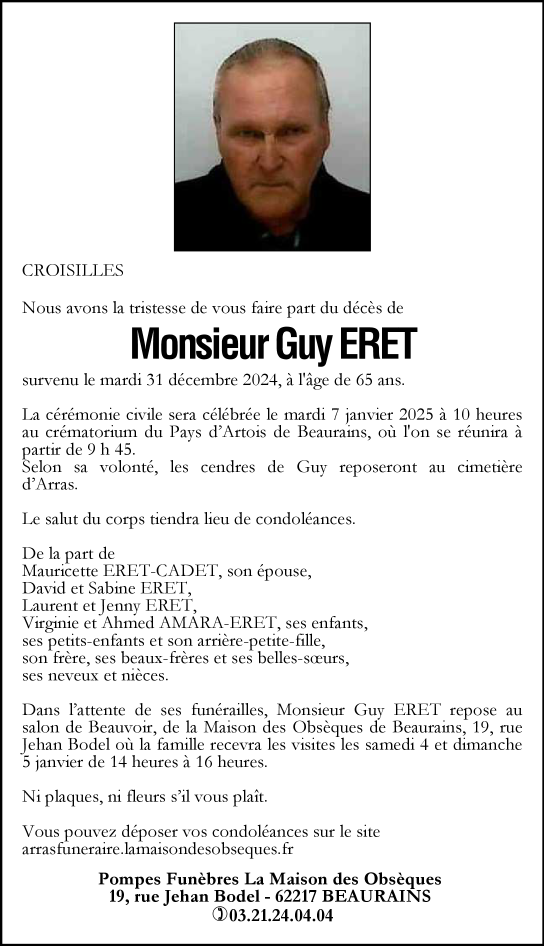 Décédé à Arras (62000, France) le mardi 31 décembre 2024 à l'âge de 65 ans