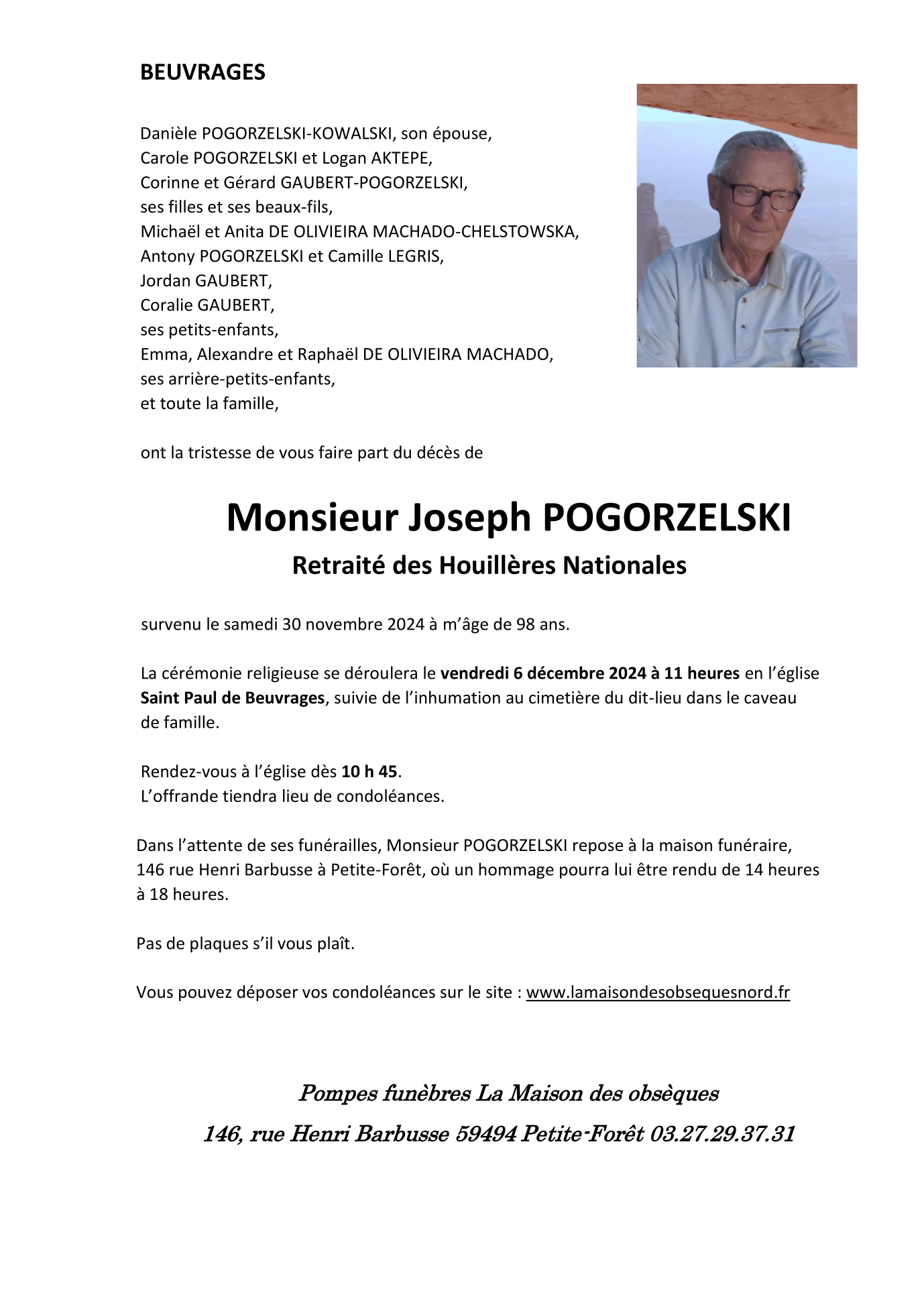 Décédé à Aulnoy-lez-Valenciennes (59300, France) le samedi 30 novembre 2024 à l'âge de 98 ans