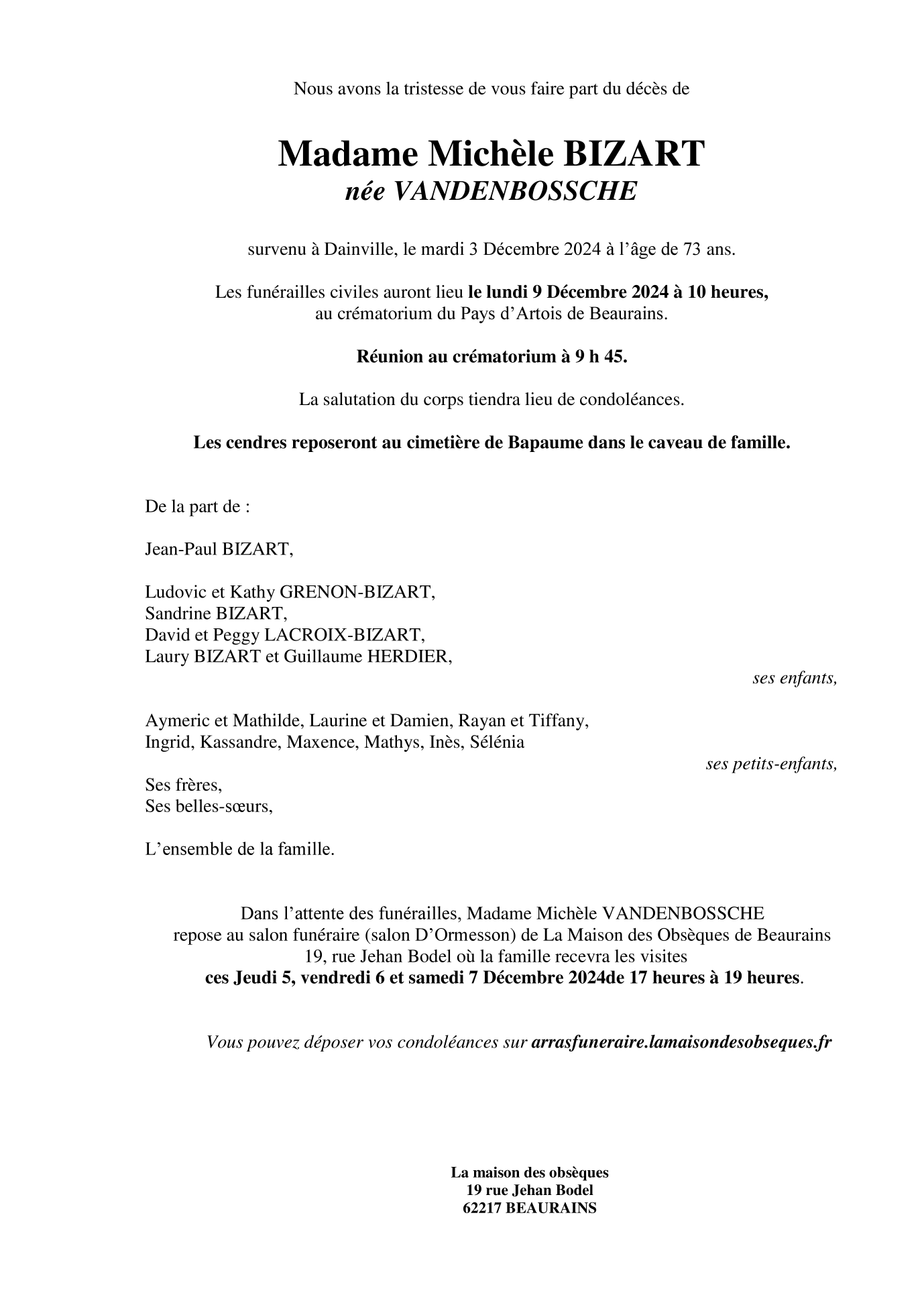 Décédée à Dainville (62000, France) le mardi 3 décembre 2024 à l'âge de 73 ans