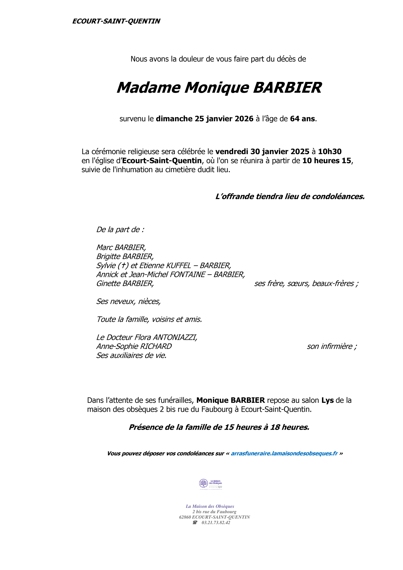 Décédée à Écourt-Saint-Quentin (62860, France) le dimanche 25 janvier 2026 à l'âge de 64 ans