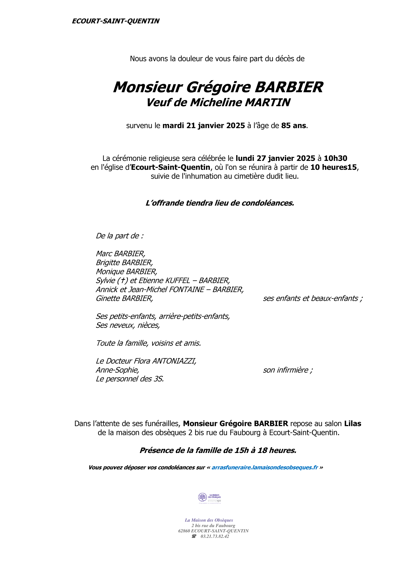 Décédé à Écourt-Saint-Quentin (62860, France) le mardi 21 janvier 2025 à l'âge de 85 ans