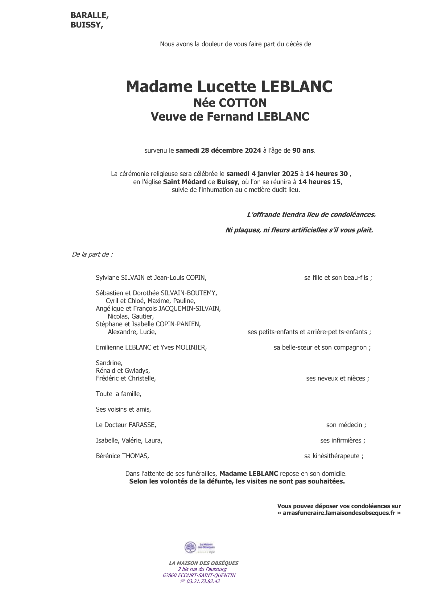 Décédée à Baralle (62860, France) le samedi 28 décembre 2024 à l'âge de 90 ans