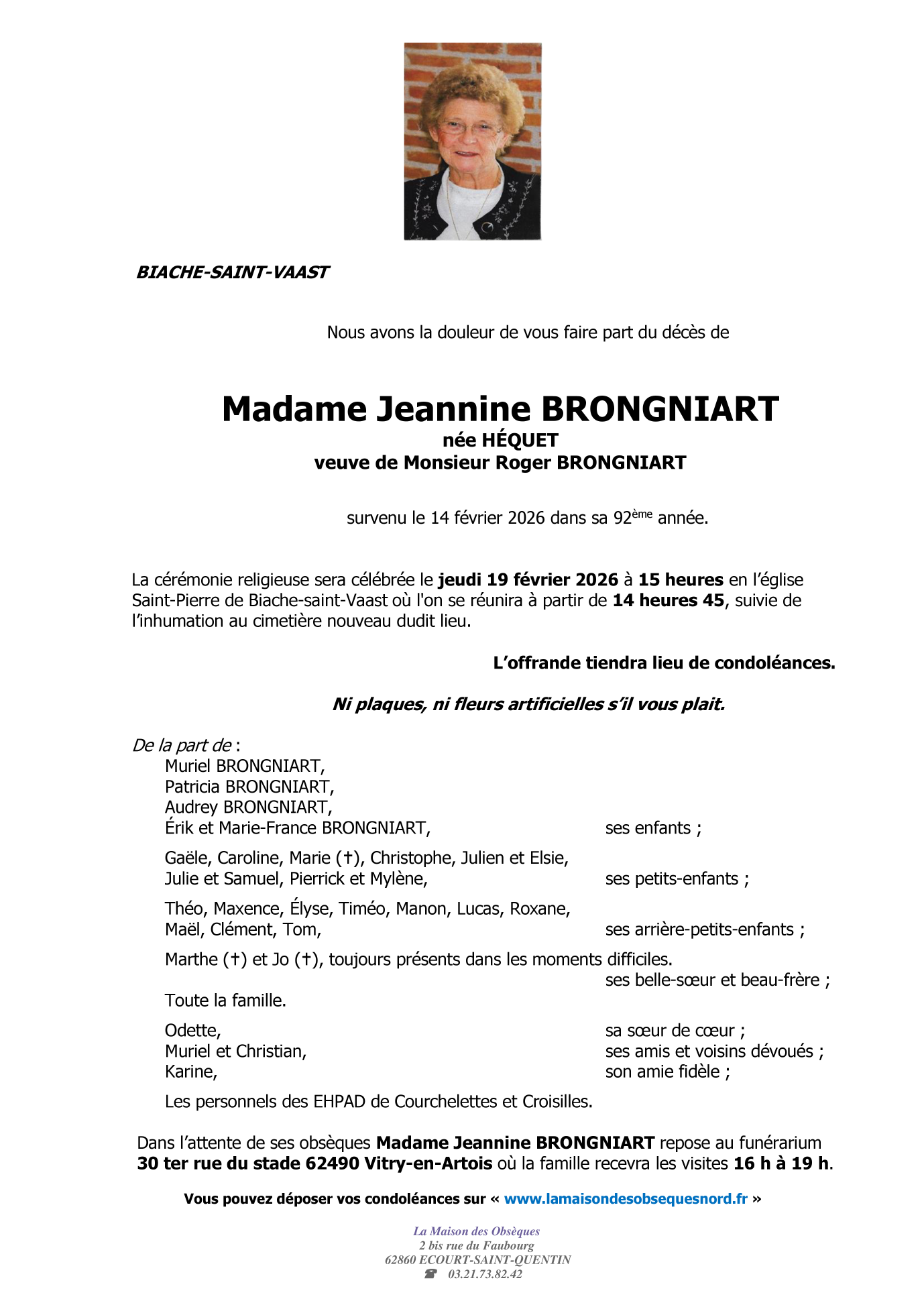 Décédée à Croisilles (62128, France) le samedi 14 février 2026 à l'âge de 91 ans