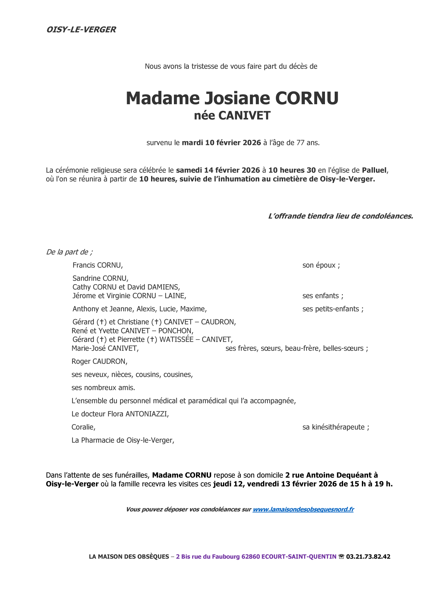 Décédée à Oisy-le-Verger (62860, France) le mardi 10 février 2026 à l'âge de 77 ans
