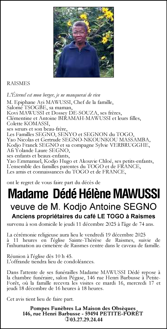 Décédée à Raismes (59590, France) le jeudi 11 décembre 2025 à l'âge de 74 ans