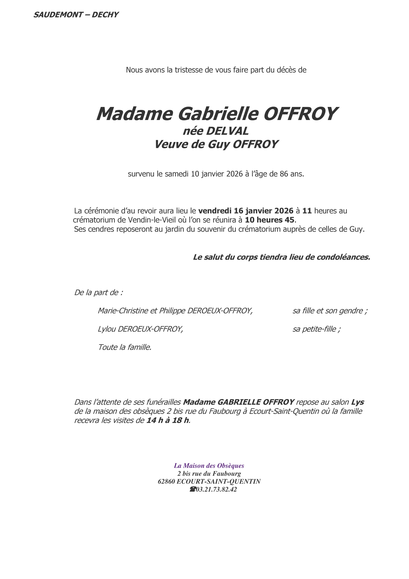 Veuve de Monsieur Guy OFFROY