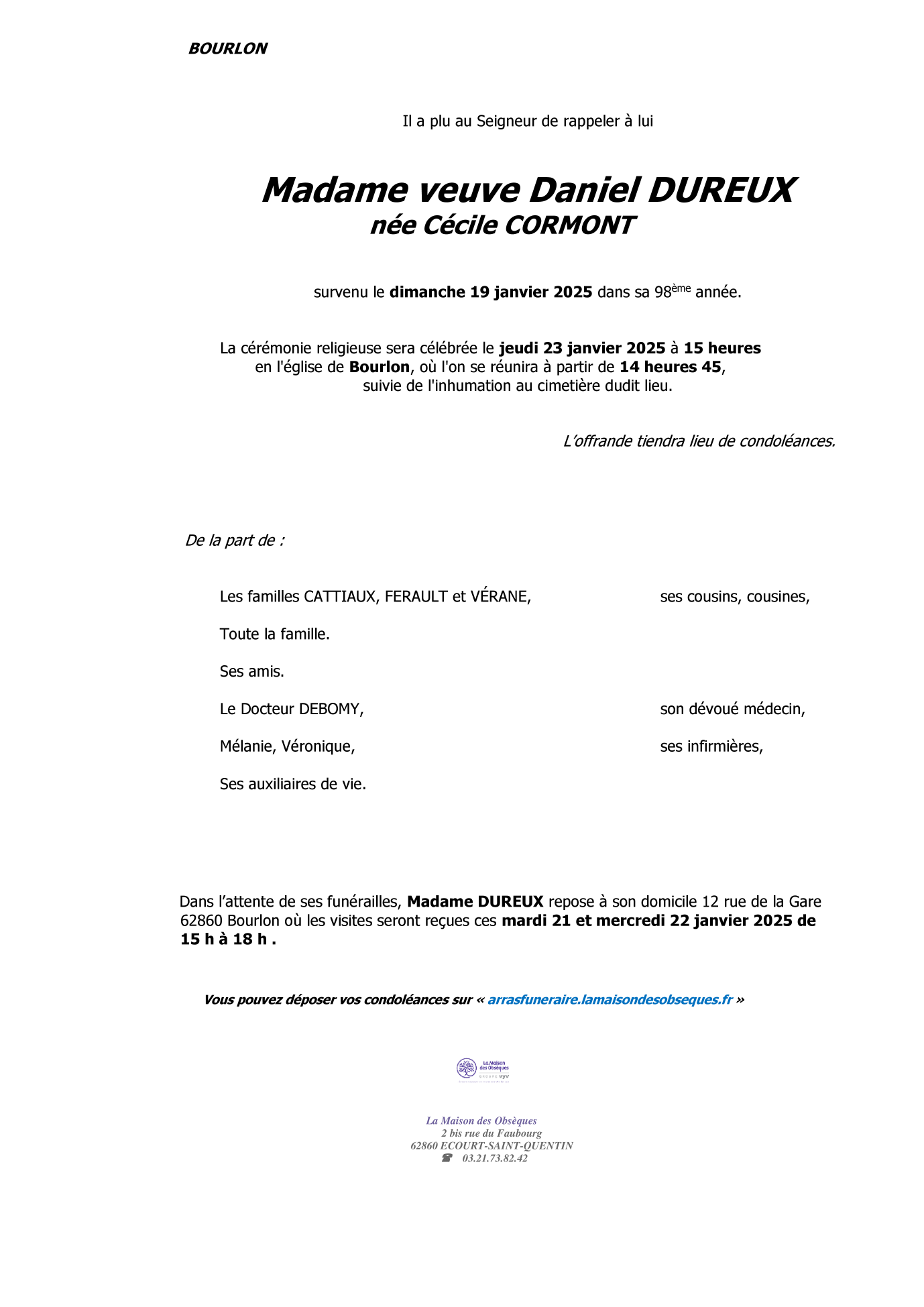 Veuve de Monsieur Daniel DUREUX