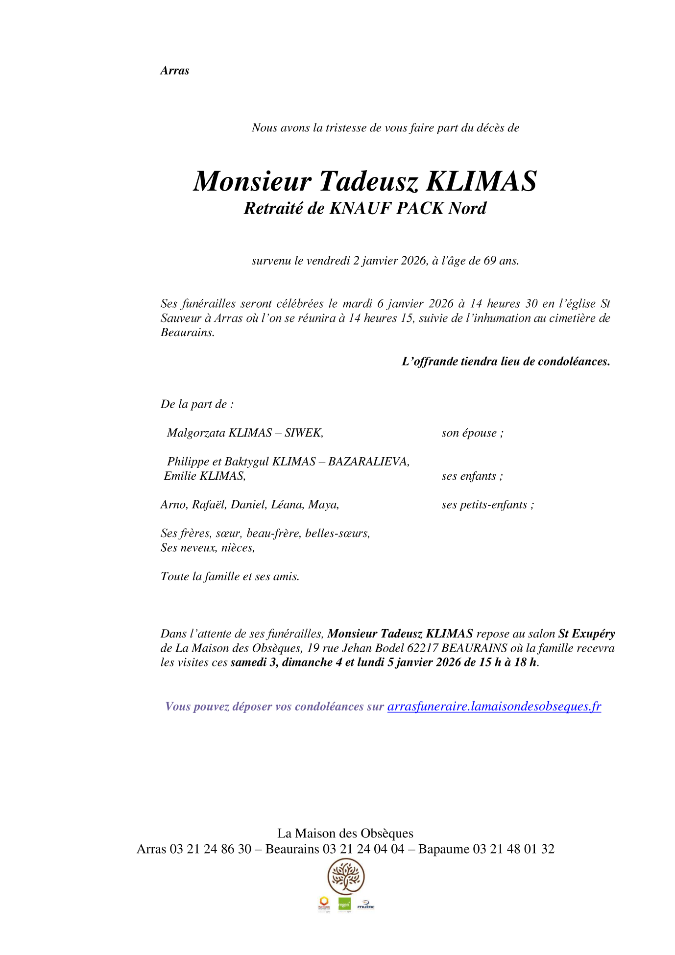 Décédé à Arras (62000, France) le vendredi 2 janvier 2026 à l'âge de 69 ans