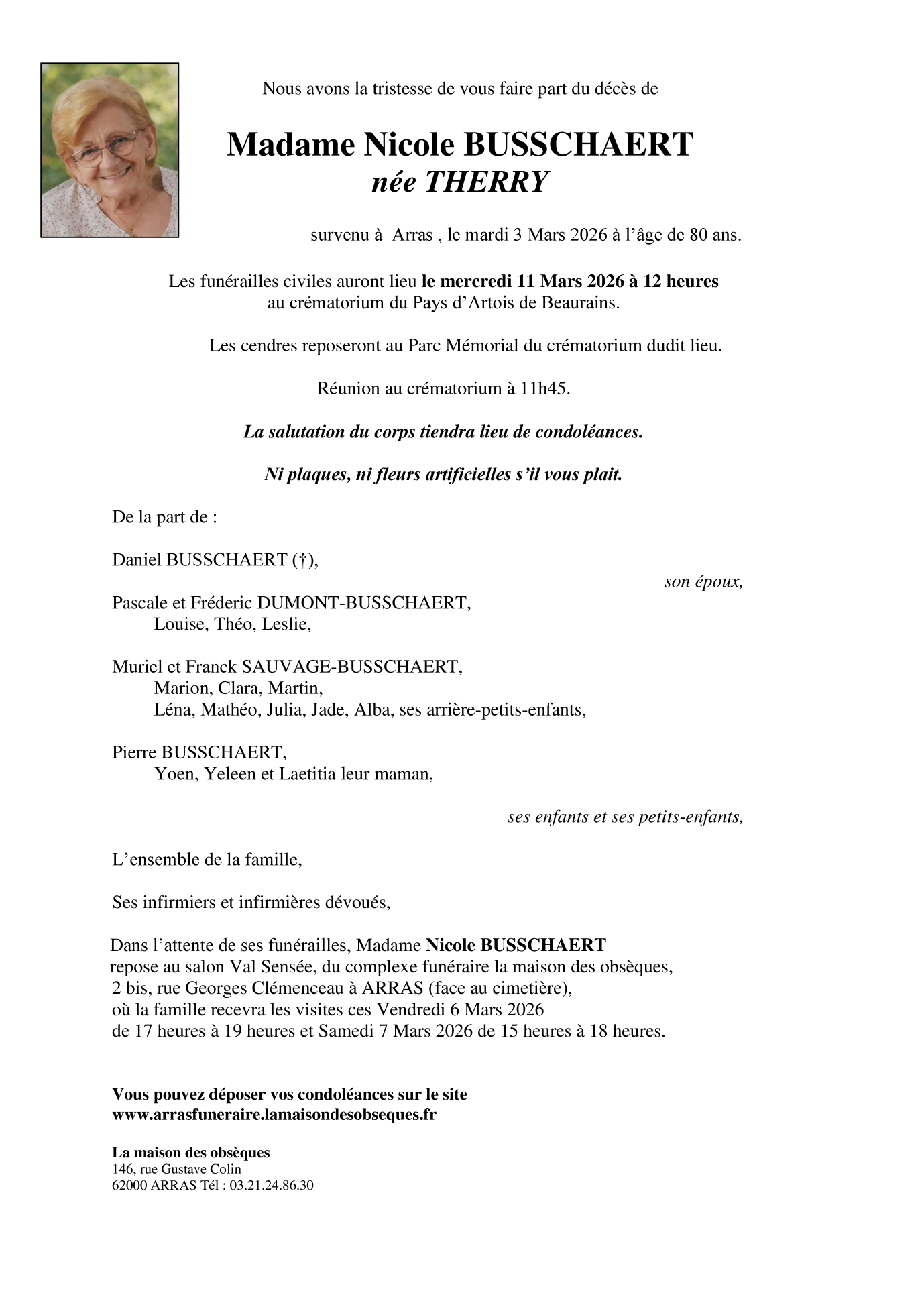 Décédée à Arras (62000, France) le mardi 3 mars 2026 à l'âge de 80 ans