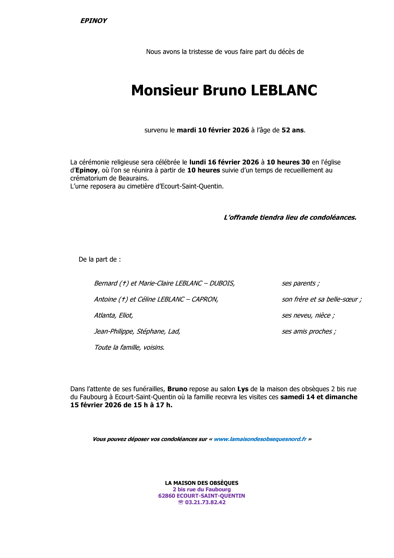 Décédé à Epinoy (62860, France) le mardi 10 février 2026 à l'âge de 52 ans