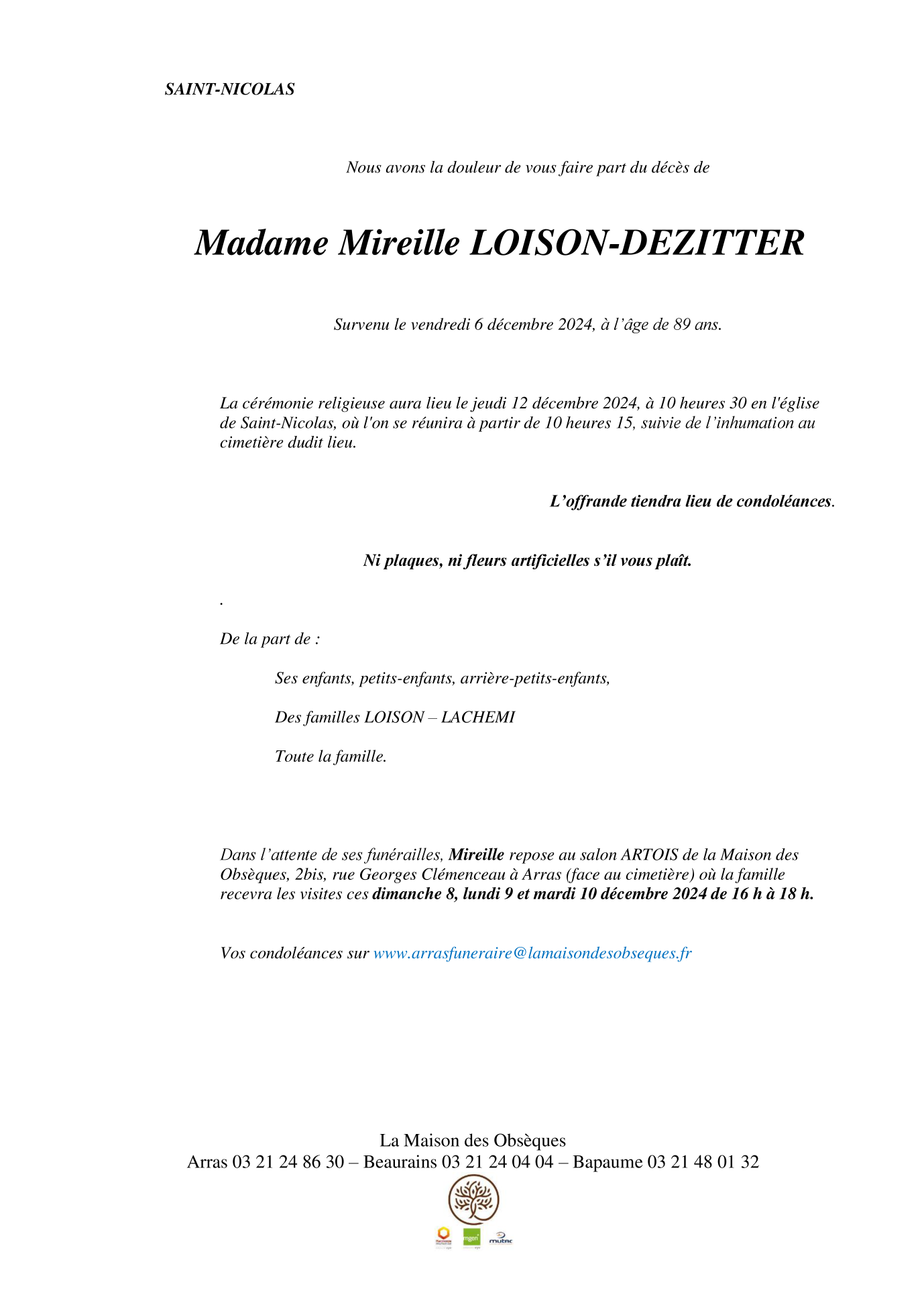 Décédée à Saint-Nicolas (62223, France) le vendredi 6 décembre 2024 à l'âge de 89 ans