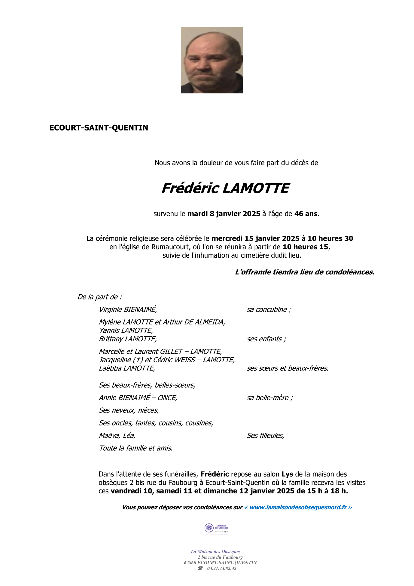 Décédé à Écourt-Saint-Quentin (62860, France) le mercredi 8 janvier 2025 à l'âge de 46 ans